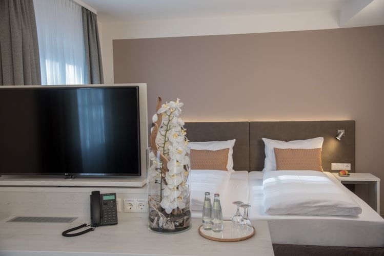 92 lichte, functionele kamers (tweepersoonskamers ca. 23 m², eenpersoonskamers ca. 19 m²), allemaal met bad of douche/WC, föhn, satelliet-tv, telefoon.